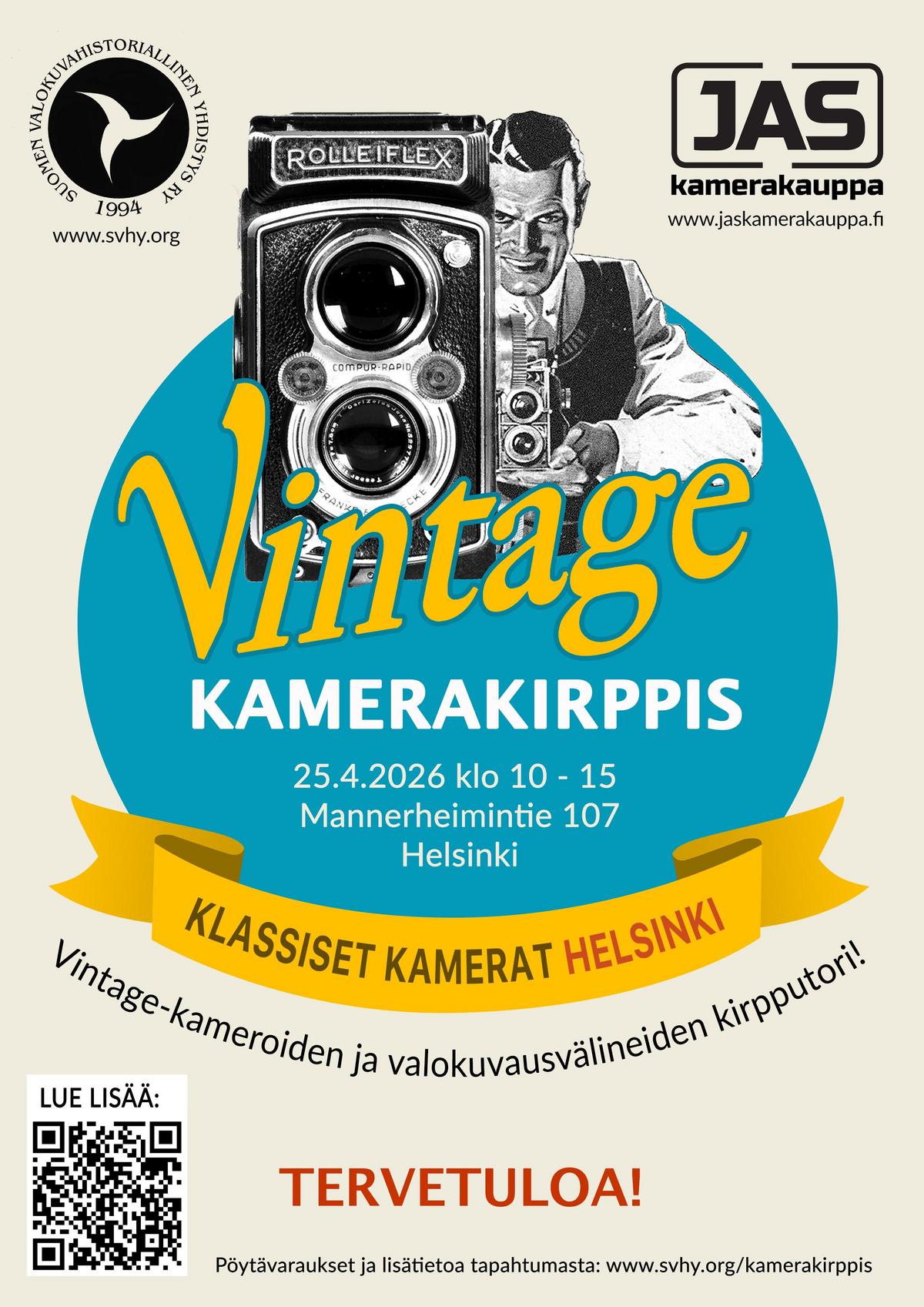 Kevään toinen Vintage-kamerakirppis järjestetään lauantaina 25.4.2026 uudessa paikassa, Invalidiliiton talossa Nauvontie 8, (Mannerheimintie 107), klo 10 – 15. Ruskeasuolla. Katso tarkemmin Kamerakirppis.